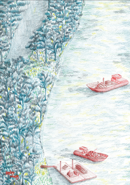 J’essaie de capter ce paysage en mouvement : ni effondrement, ni effacement complet, mais une réinvention douce, presque naturelle. Les oiseaux reviennent déjà sur certains tronçons, intrigués par l’agitation. L’air sent la terre retournée, le bois mis à nu et une légère odeur de pluie. Depuis l’eau, impossible de ne pas ressentir une forme de continuité. Le village ne disparaît pas : il se réoriente. Il laisse de la place. Ici, tout change, mais rien ne semble perdu.