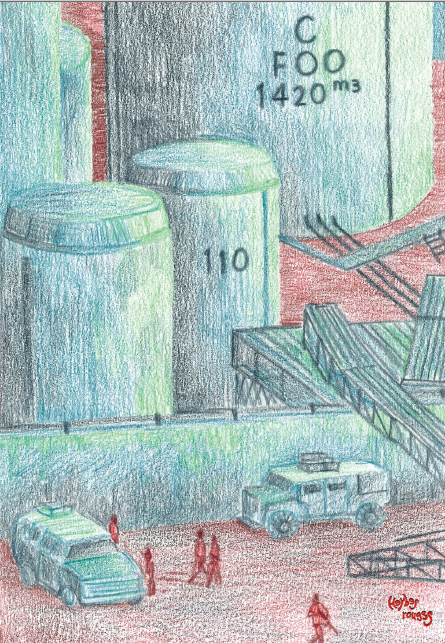 En approchant du rivage, de premières formes émergent. Géantes. Sourdes. De hautes cuves s’imposent au paysage comme des statues de divinités dont on aurait perdu la foi. Pourtant, elles semblent gardées. Des militaires circulent en cadence, silhouettes régulières contre le métal bombé. La présence est dissuasive, presque chorégraphiée. Je me demande ce qu’ils protègent exactement : un liquide au parfum de fin du monde, devenu rare et précieux parce qu’on l’a brûlé sans compter. Un or noir désormais réservé à quelques usages jugés stratégiques, dans une économie qui s’effrite. Autour d’eux, rien ne vit. Pas un oiseau, pas un souffle. Seulement cette odeur, âcre, qui se mélange au sel de l’air.