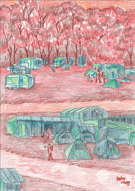 En suivant l’eau, je contourne les grilles, longe les clôtures, glisse le long du bord que les barbelés n’ont pas encore conquis. La presqu’île change de peau. Je tombe sur une vie souterraine au grand jour. Des abris bricolés, des campements qui se sont agrandis à mesure que montait la mer et descendait l’attention publique. Iels sont là : celleux qui étaient déjà présent·es avant que l’eau ne gagne du terrain, et celleux venu·es après, fuyant des crises politiques, climatiques ou administratives. Ici, aucune protection armée. Seulement des digues de fortune et l’invisibilité comme seule barrière. L’eau, montée ces dernières années, fait écran ; une séparation silencieuse mais efficace. Le territoire n’attire plus les convoiteux : trop risqué, trop mouvant, trop humide. Alors on laisse les gens ici, comme des restes que l’on ne sait plus où ranger. Je discute un moment. On me parle d’expulsions jamais menées à bout, de retours clandestins, de tempêtes qui emportent les planches mais jamais la communauté.