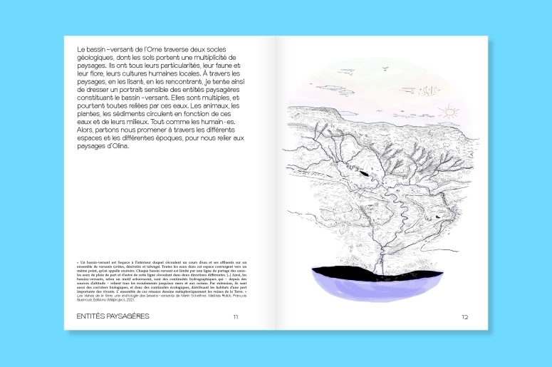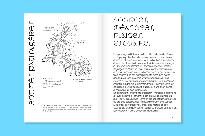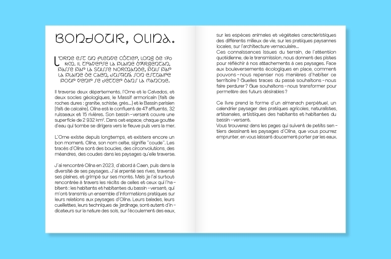 Les tracés d’Olina forment des méandres, des coudes, des circonvolutions dans les paysages qu’elle dessine. Son bassin-versant est peuplé d’un ensemble d’êtres vivants, habitant·es traversé·es par les eaux, à la fois dans leurs corps et dans leur vie quotidienne. Cet almanach perpétuel transmet les récits de leurs attachements aux paysages d’Olina. Au rythme des saisons, des journées, de l’écoulement des eaux, les gestes et les pratiques racontés ici, peuvent aider à suivre les chemins des rivières, et à habiter avec soin les milieux de vie partagés.